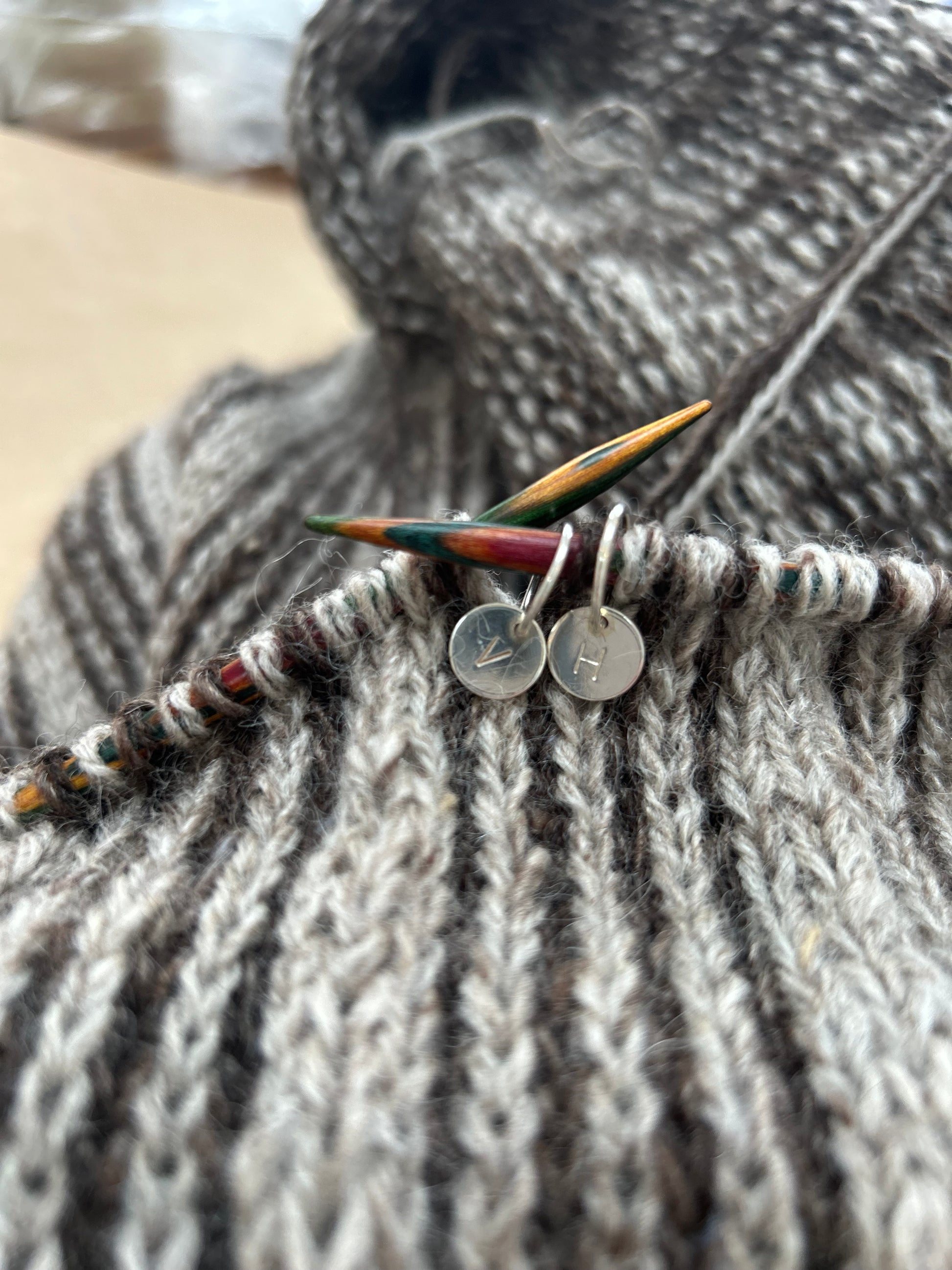 To markører i sølv med stempel af henholdsvis h/v så du kan have styr på enten ærmer eller udtagninger.