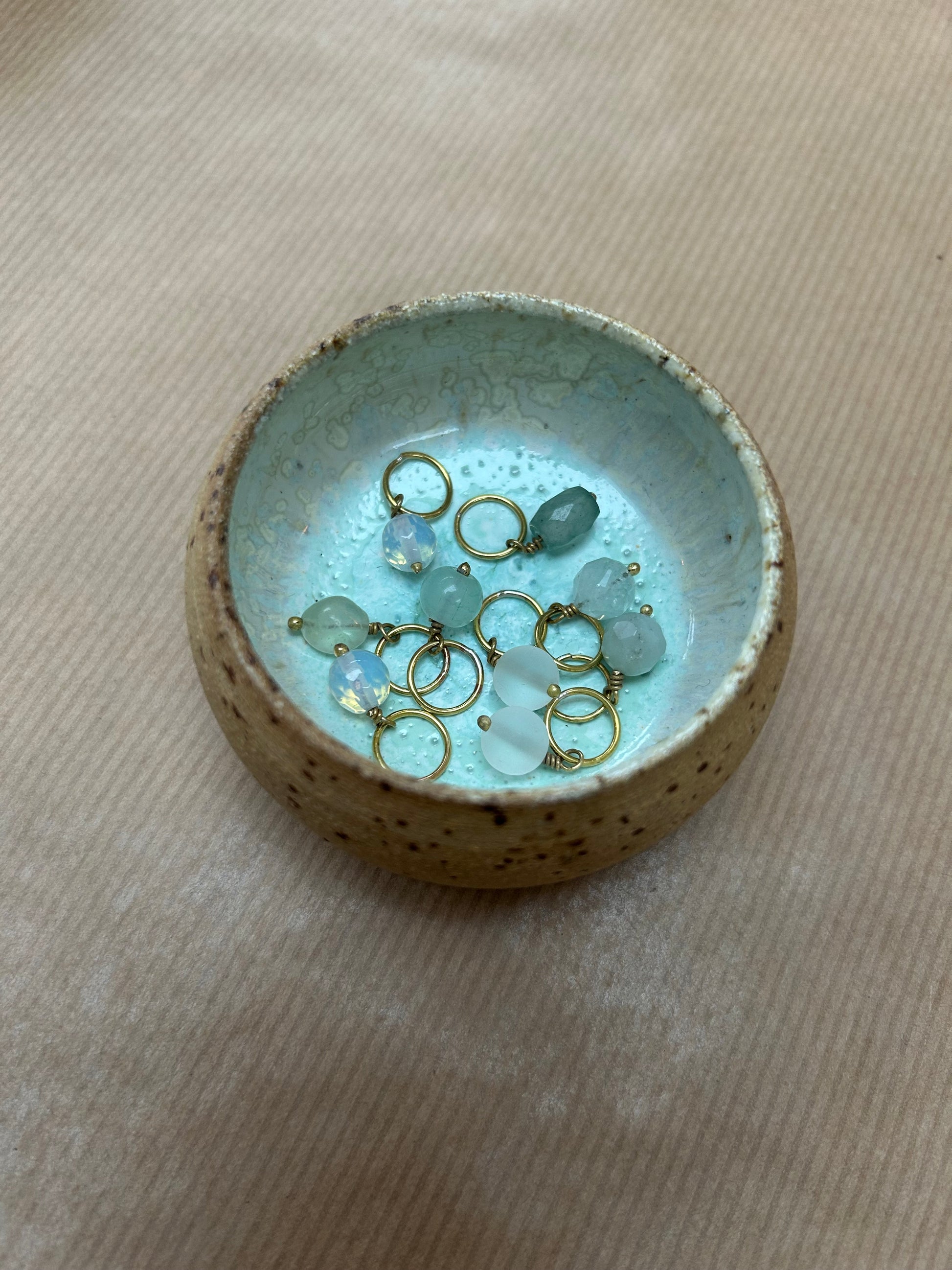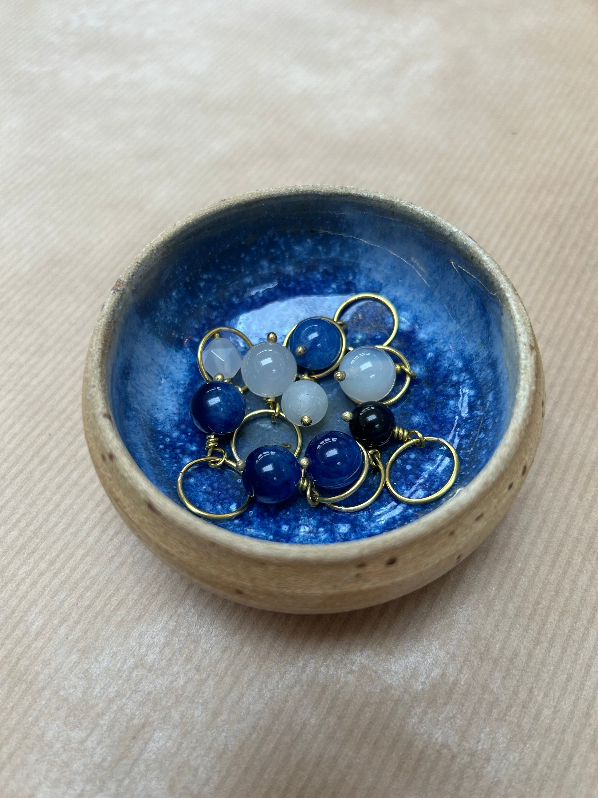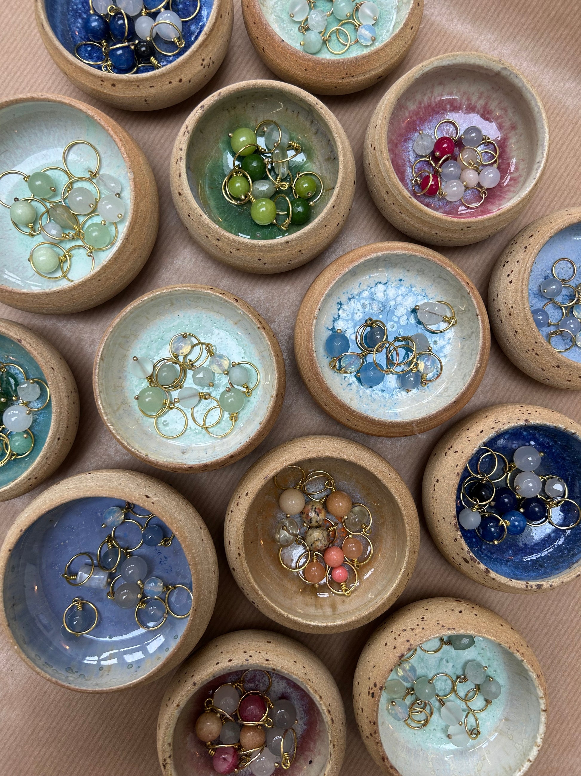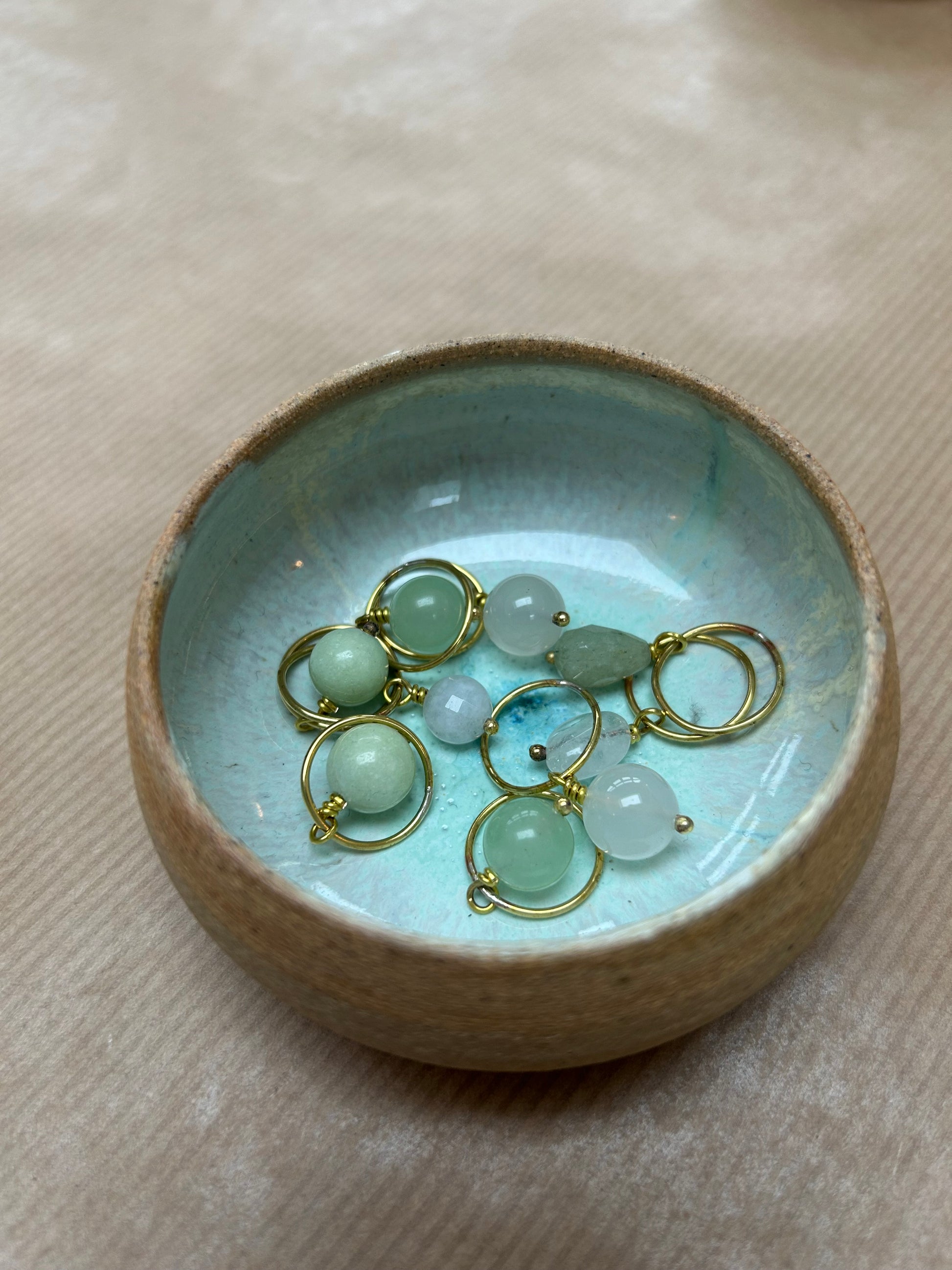 Håndlavet maskemarkørsæt i messing med ædelstensperler, farveafstemt efter keramikskålens glasur.