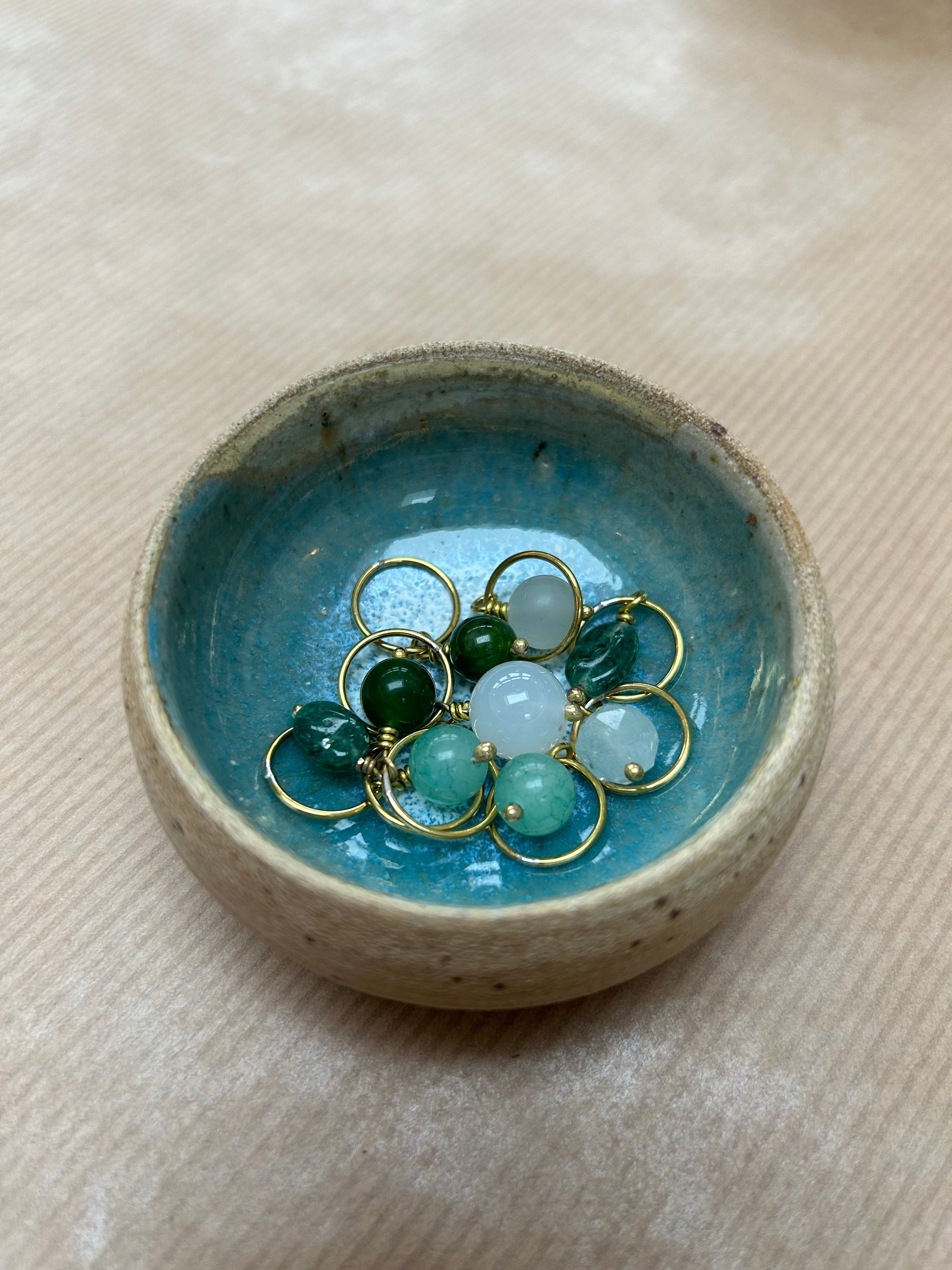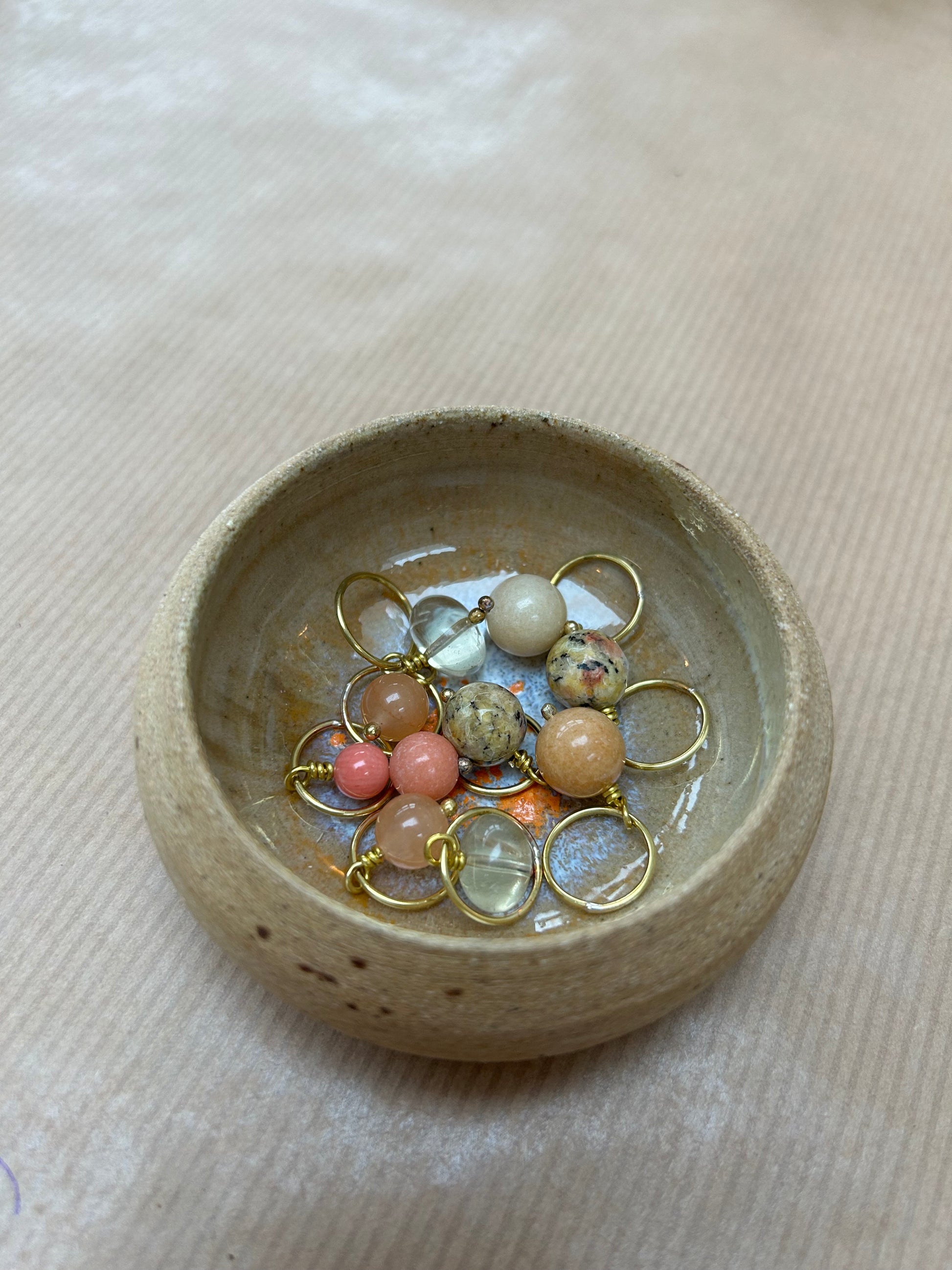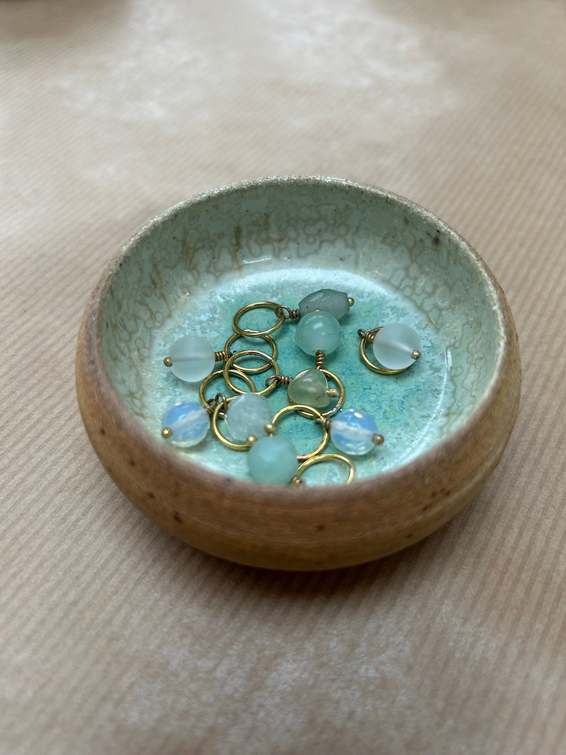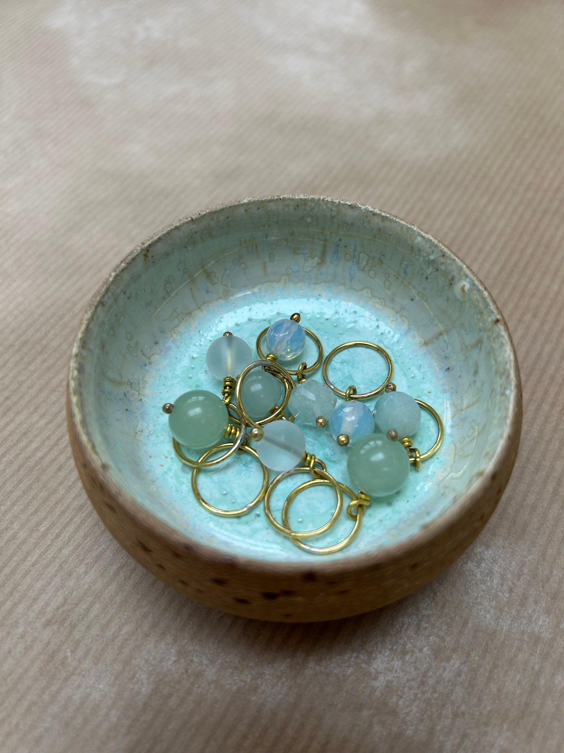 Håndlavet maskemarkørsæt i messing med ædelstensperler, farveafstemt efter keramikskålens glasur.