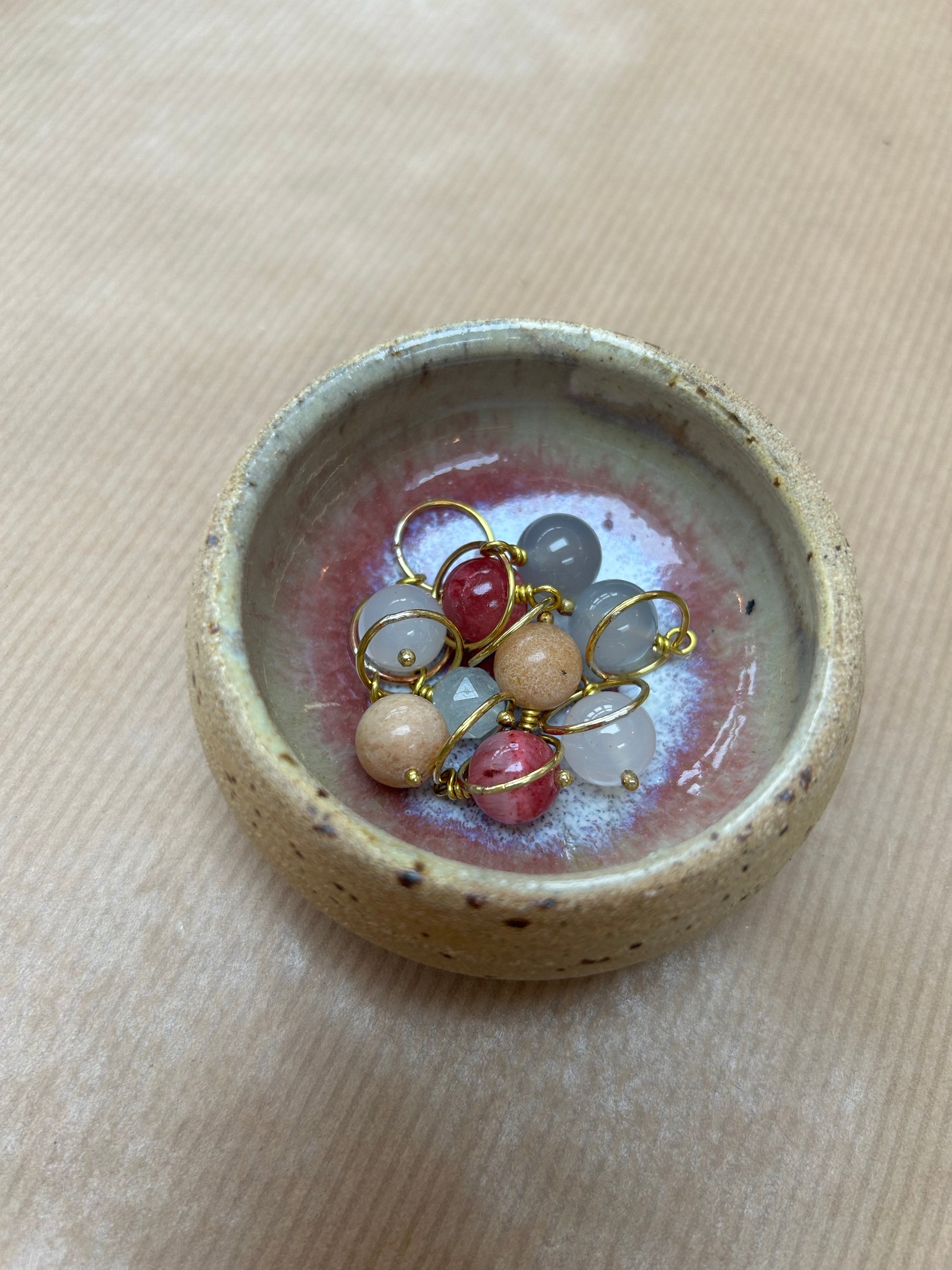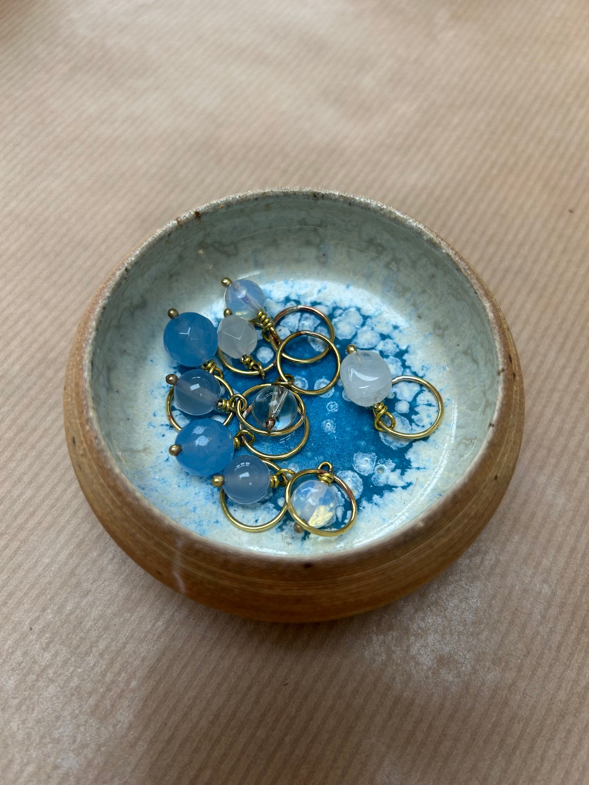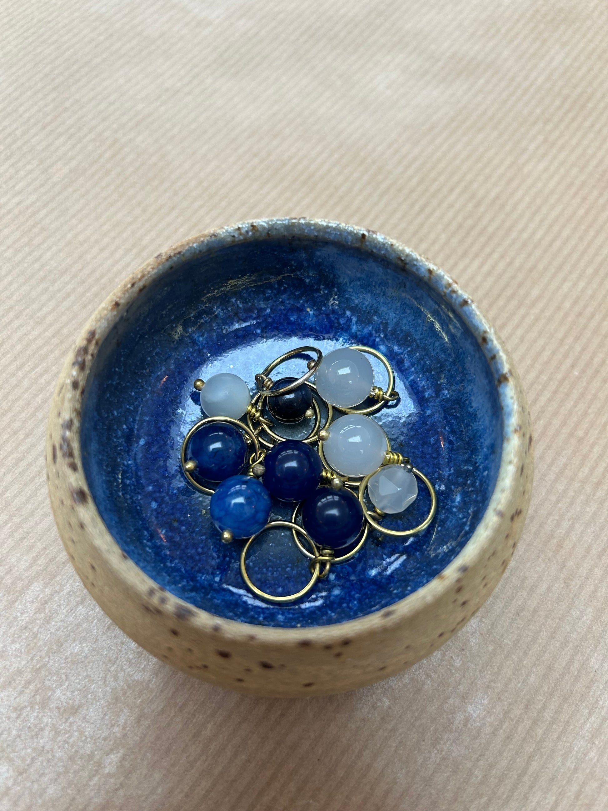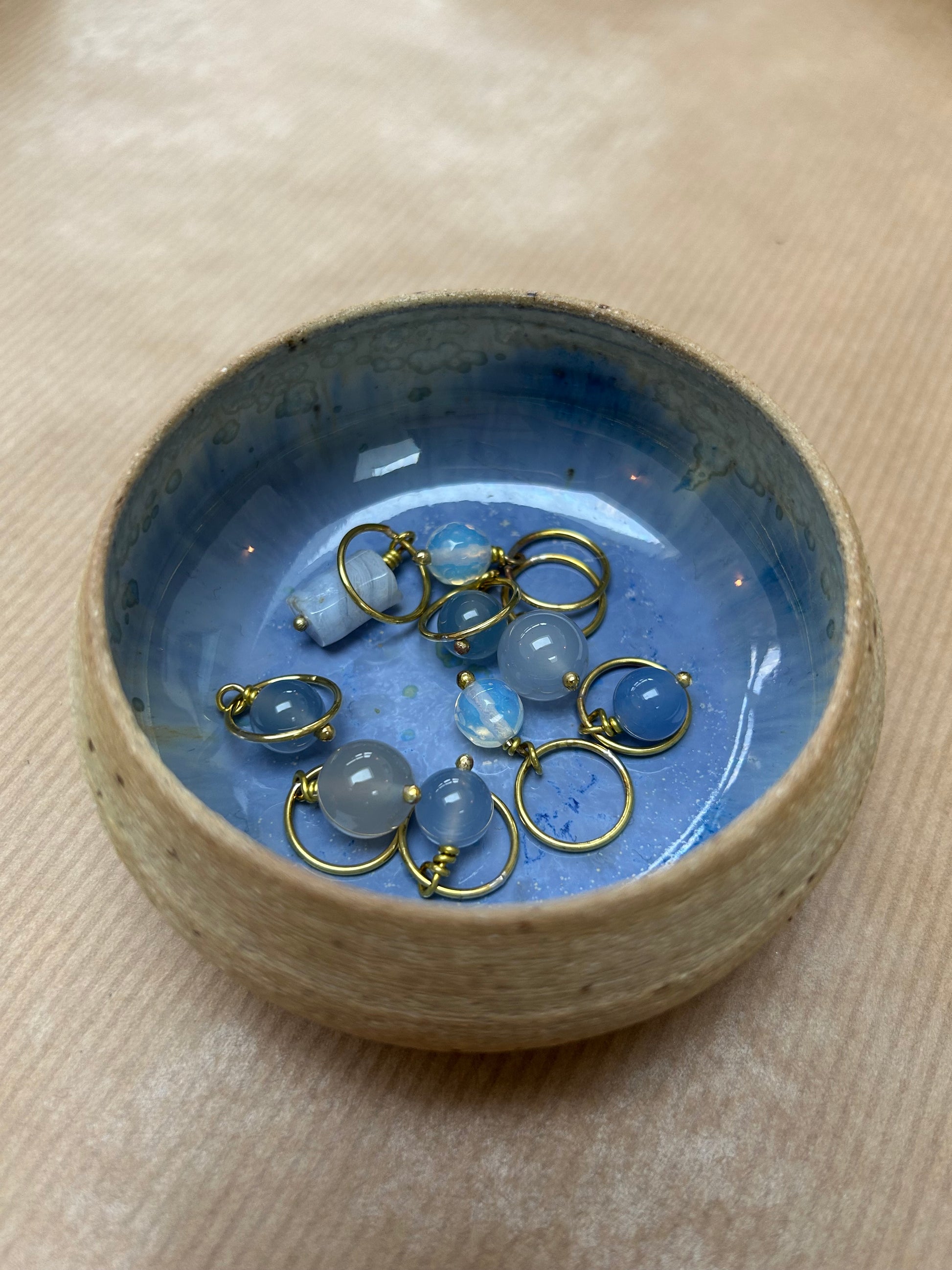 Håndlavet maskemarkørsæt i messing med ædelstensperler, farveafstemt efter keramikskålens glasur.