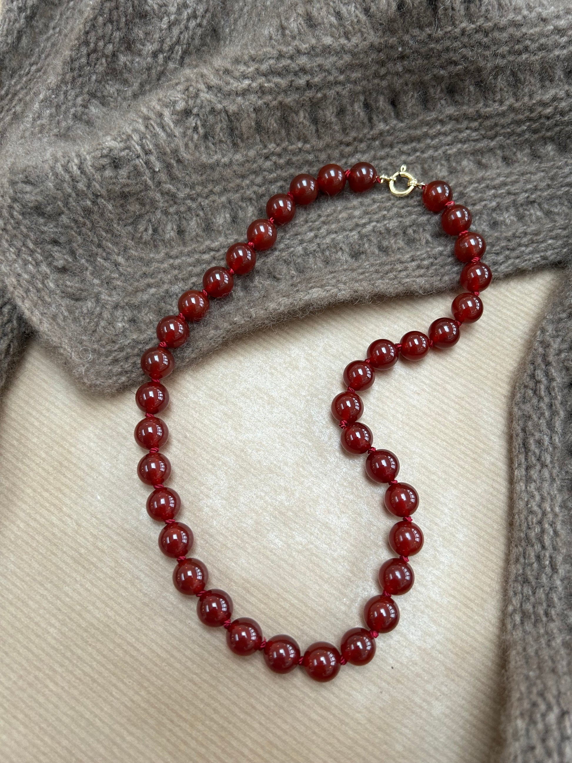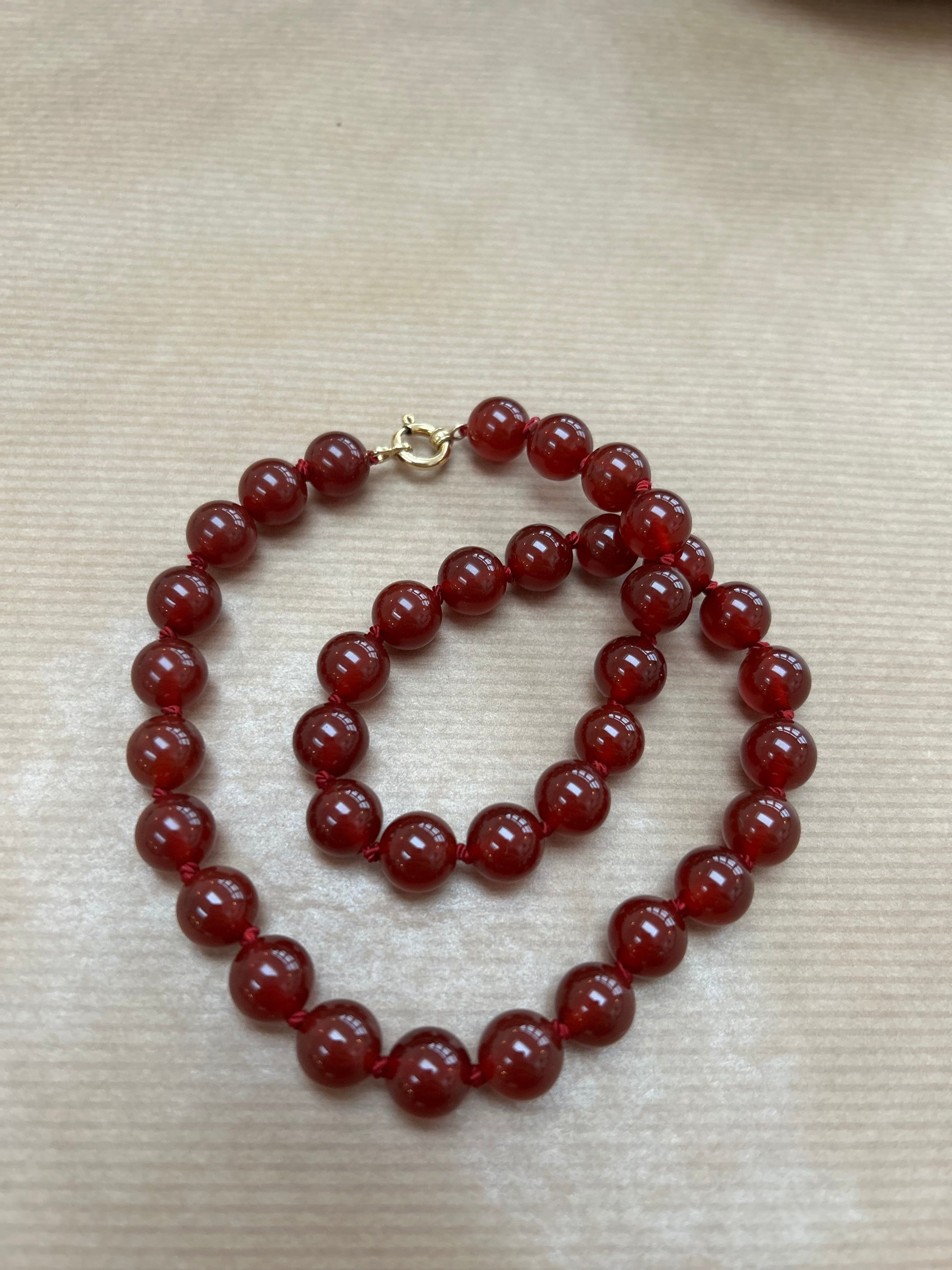 Stenperlekæde med stenperler i dyb rød “karneol” farve.