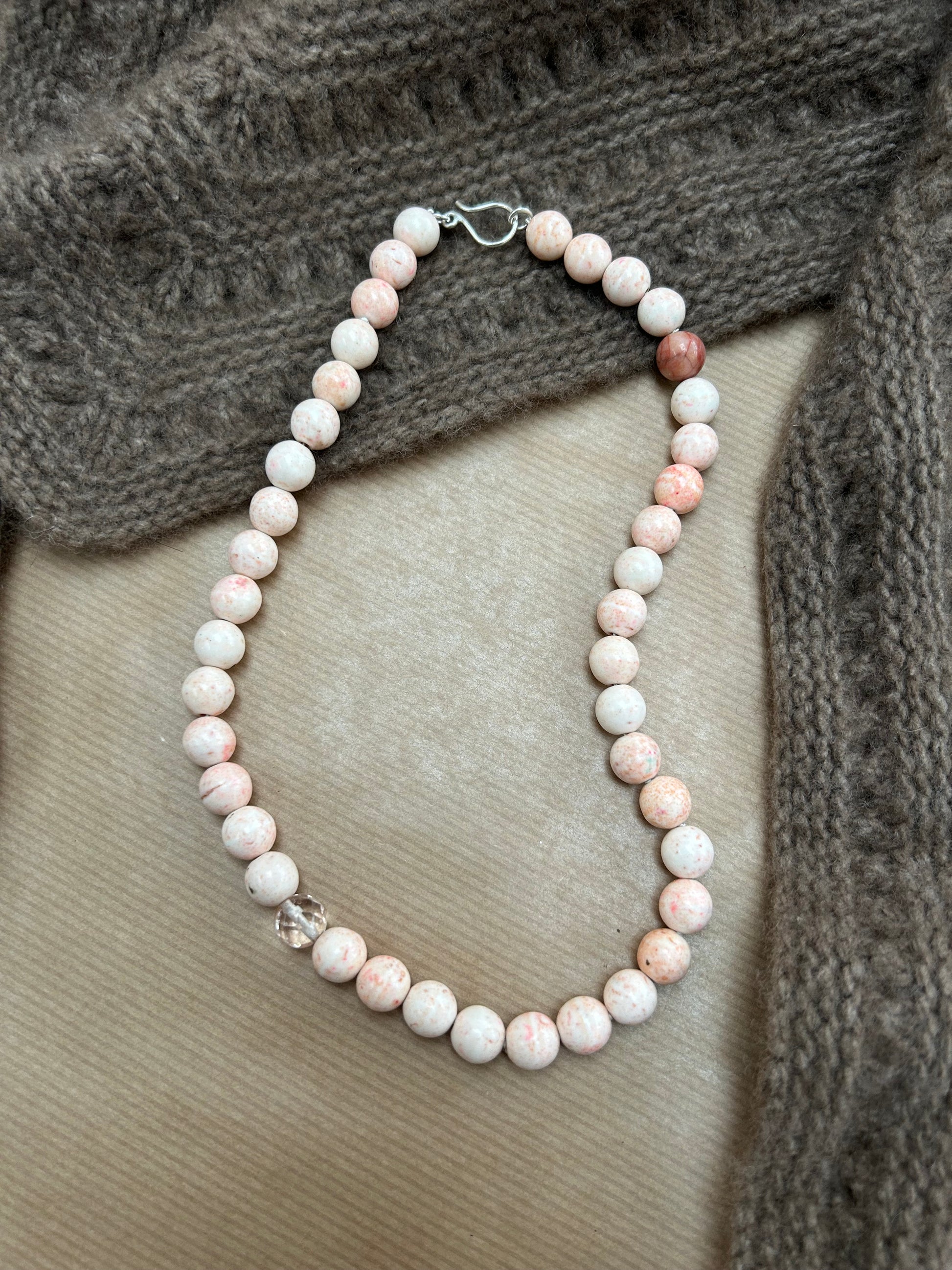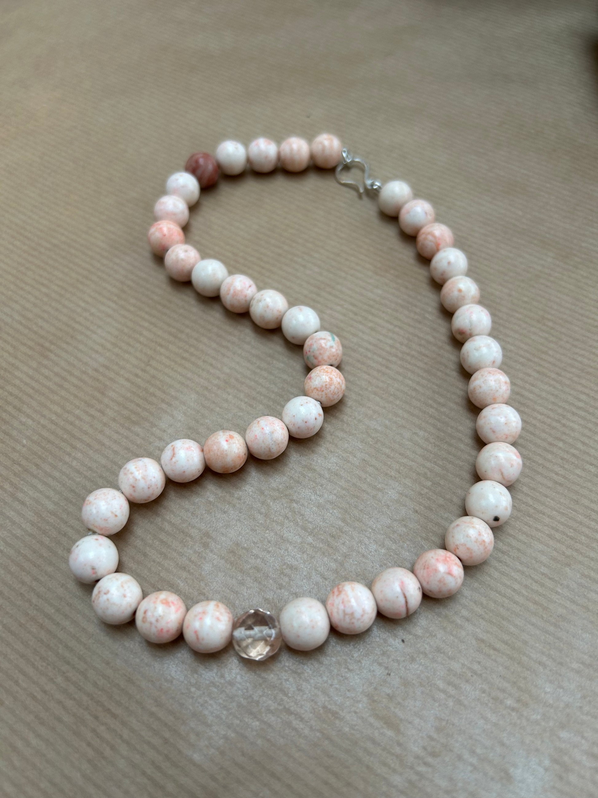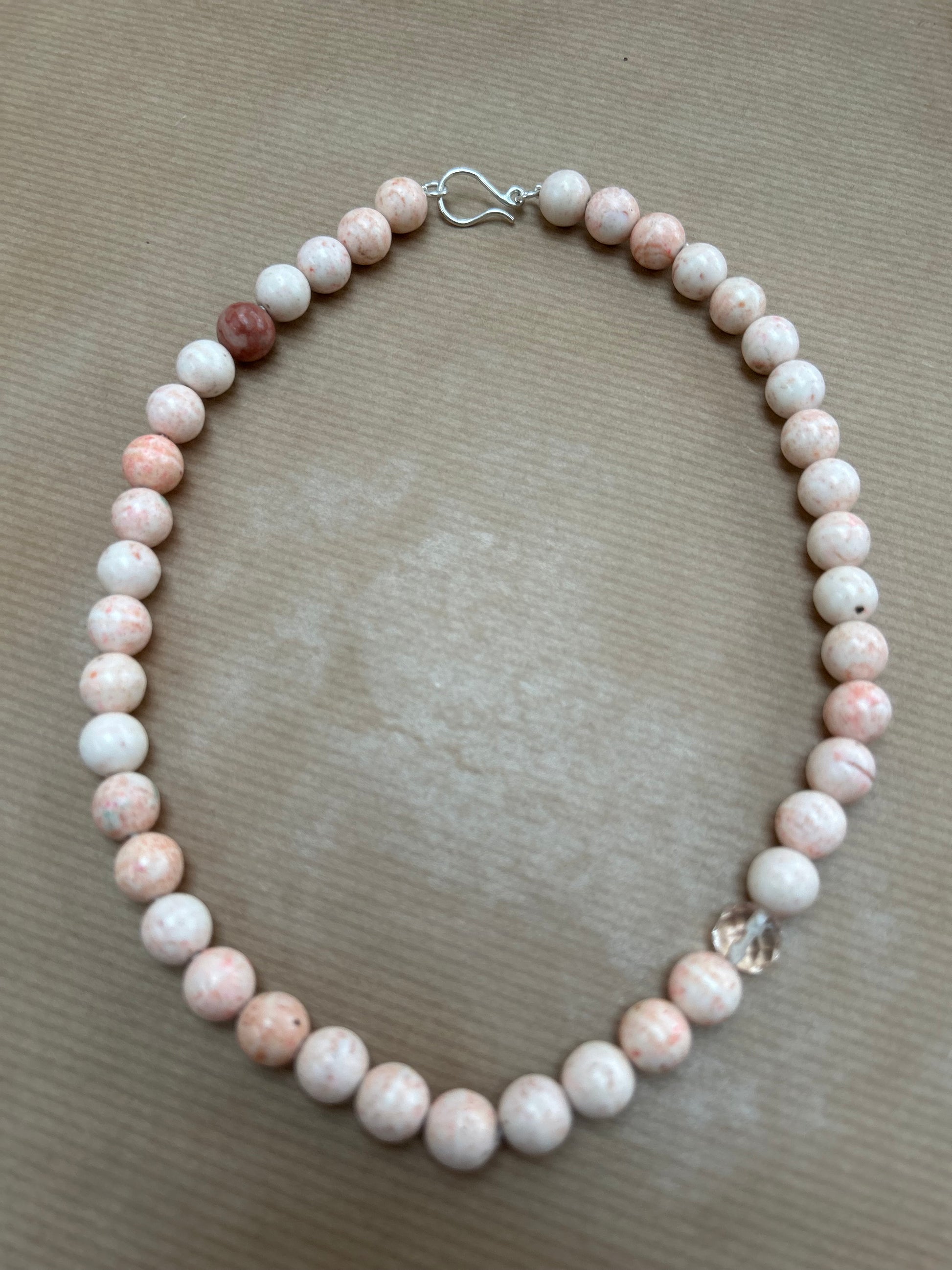 Lækker Stenperlekæde I Rosa nuancer med fin detalje af facetslebet klar rosasten flettet imellem.